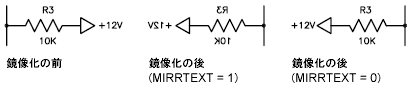 MIRRTEXT の設定は、TEXT[文字記入]、ATTDEF[属性定義]、または MTEXT[マルチ テキスト]コマンドで作成された文字や、属性定義、変数属性に影響を与えます。挿入したブロックの一部である文字と定数属性は、ブロックが鏡像化されると、システム変数 MIRRTEXT の設定に関わらず反転されます。