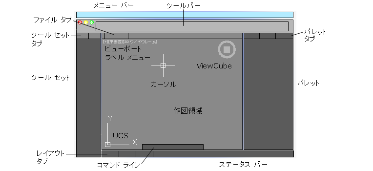 ユーザ インタフェースとして、作図領域の周囲にパレットやバーが表示されます。また、作図領域内にいくつかのコントロールが表示されます。