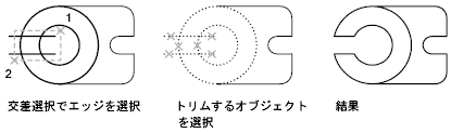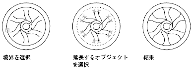 標準モードを使用する場合、切り取りエッジまたは境界エッジとして選択するオブジェクトは、トリムするオブジェクトと交差している必要はありません。オブジェクトは、仮想エッジまたは仮想交点(延長したときにオブジェクトが交差する位置)までトリムまたは延長できます。