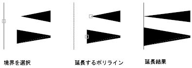 テーパ(ふくらみ)の付いた 2D ポリライン セグメントをトリムまたは延長すると、可能な場合は延長された端の幅が修正され、元のテーパが新しい端点まで延長されます。それ以外の場合、終了幅は強制的に0 (鋭い点)になります。