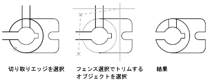 複数のオブジェクトをトリムする場合は、さまざまな選択方法を使用して、現在の切り取りエッジとトリムするオブジェクトを簡単に選択できます。次の例では、交差窓選択を使用して切り取りエッジを選択しています。