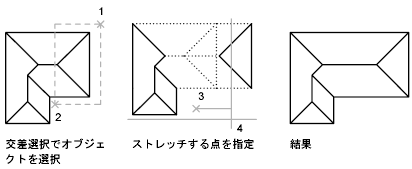 STRETCH[ストレッチ]では、交差選択窓と交差するオブジェクト、またはその内側にあるオブジェクトの端点の位置を変更します。