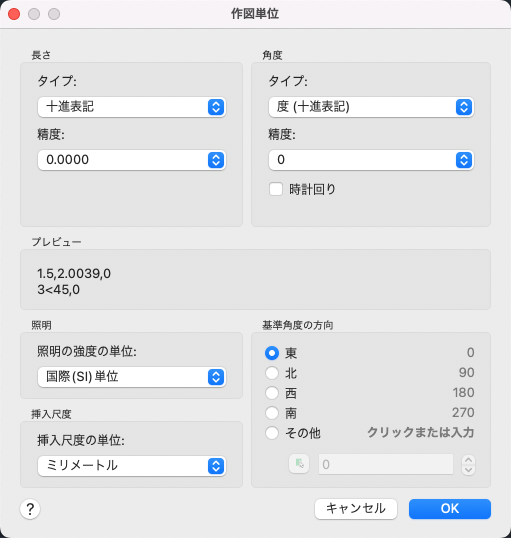 角度 0(ゼロ)の方向を設定します。次のオプションは、角度の入力、表示形式、極座標、円柱座標、球座標の入力に影響します。