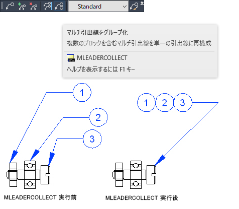 内容としてブロックを使用したマルチ引出線オブジェクトを、1 つの参照線に集めて、アタッチできます。MLEADERCOLLECT[マルチ引出線グループ化]コマンドを使用すると、マルチ引出線が、図面での必要性に応じて、水平、垂直、または指定した領域内に集約されます。