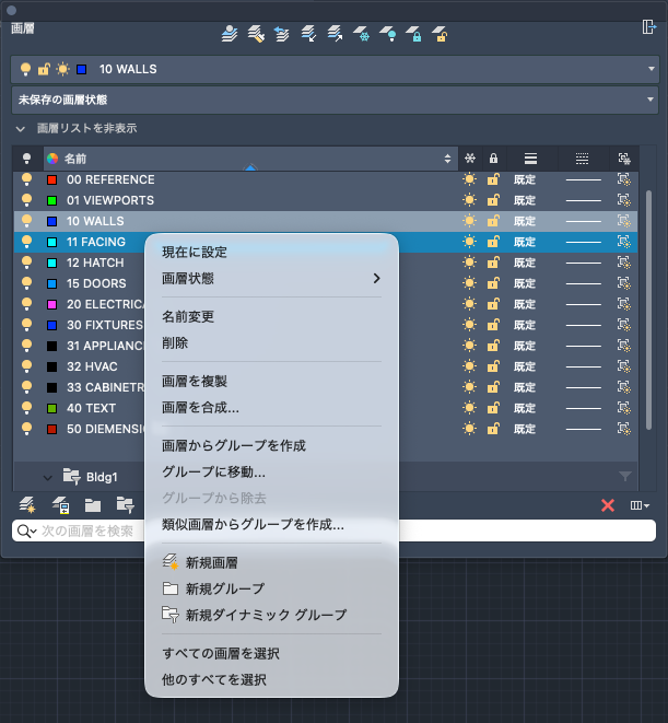 図面の画層とそのプロパティの一覧が表示されます。画層の追加、削除、名前変更を行ったり、画層のプロパティを変更したり、リアルタイムに変更を適用することができます。