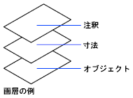 オブジェクトの表示/非表示を切り替えたり、色や線種などのプロパティを割り当てるには、画層を使用します。画層上のオブジェクトは通常、画層のプロパティを継承します。しかし、オブジェクトの画層のプロパティより優先する値に設定することができます。たとえば、オブジェクトの色プロパティが BYLAYER に設定されていると、オブジェクトは画層の色で表示されます。オブジェクトの色を赤に設定すると、画層に割り当てられた色は無視され、オブジェクトは赤で表示されます。