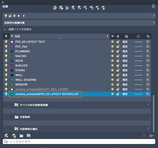 図面ファイルをアタッチすると、その図面の画層と画層のプロパティが現在の図面に追加されます。各画層名の前には外部参照の名前が追加されます。外部参照の名前は、参照図面ファイル名とは異なることがあります。