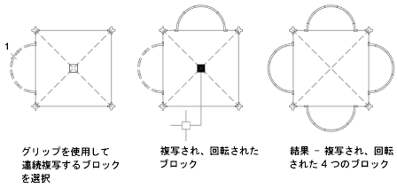 たとえば、[複写(C)]オプションを使用すると、選択したオブジェクトを回転すると同時に、ポインティング デバイスで指定した位置にオブジェクトのコピーを配置することができます。