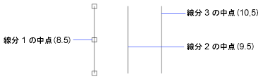 [Ctrl]を押しながら、ポインティング デバイスを使用して複数の複写点を指定すると、最後に指定した 2 点に基づくオフセット点にグラフィック カーソルがスナップします。次の図では、線分 1 の中点は座標(8,5)にあります。この中点を基準として、[Ctrl]とストレッチ グリップ モードを使用して線分 2 を複写すると、その中点は(9,5)になります。3 番目の線分は、座標値(10,5)に基づいたオフセットにスナップします。