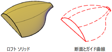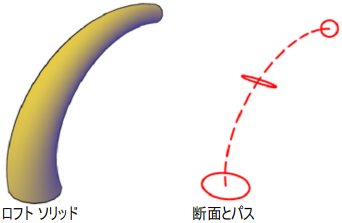 断面外形線は開いた曲線でも閉じた曲線でもかまいません。開いた曲線からはサーフェスが、閉じた曲線からはソリッドまたはサーフェスが作成されます。