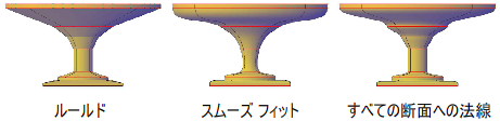 ロフト オブジェクトを作成するときは、どのように外形線が断面を通過するか(シャープな曲線または滑らかな曲線を描くように)を指定することによって、ロフト オブジェクトの形状を調整できます。後で、[プロパティ]パレットで設定を修正することもできます。