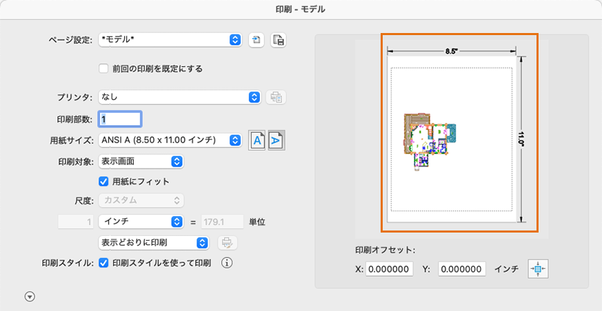 プレビュー領域を使用すると、印刷時に図面がどのように出力されるかを簡単に確認することができます。
