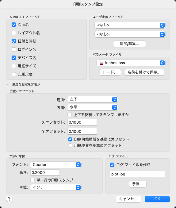別のファイル名とパスを指定できます。最初にこの plot.log ファイルが作成されると、その後図面が印刷されるたびに印刷スタンプ情報がこのファイルに追加されていきます。各図面の印刷スタンプ情報は、1 行に記録されます。印刷スタンプのログ ファイルをネットワーク ドライブに置いて複数のユーザと共有できます。各ユーザからの印刷スタンプ情報は、plot.log ファイルに追加されます。
