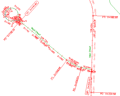 線分、曲線、および緩和曲線のラベル スタイルごとに特定のスタイルを選択できます。この線形には緩和曲線は含まれていないため、[緩和曲線ラベル スタイル]の設定は無視されます。