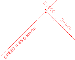 設計速度ラベルを確認します。このラベル スタイルを基に新しいラベル スタイルを作成します。新しいラベル スタイルでは、測点ラベルを使用せずに設計速度を表示します。設計速度ラベルは、既に測点がラベル付けされている位置に配置します。