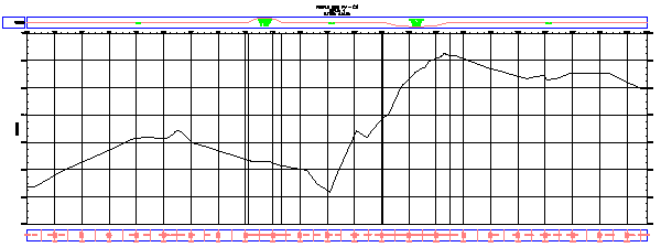 これで、図面内で PVI の計画位置をクリックして、レイアウト プロファイルを描画する用意ができました。各 PVI の位置で曲線が挿入されます。現実的に見せるために、線がサーフェス中心線の全体的な縦断を追跡します。ただし、急勾配な坂や溝を横切って平らな道路サーフェスの輪郭を描きます。