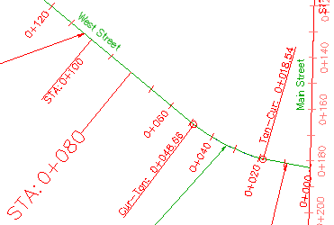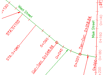 図面内で、STA:0+080 と STA:0+100 ラベルの文字はサイズが異なり、両者の文字と線分の配置が異なることに注目してください。子スタイルは、作成元である親スタイルと基本プロパティを共有します。親スタイルのプロパティ値を変更すると、その変更内容が子スタイルにも適用されます。ただし、子スタイルのプロパティ値を変更しても、親スタイルには適用されません。