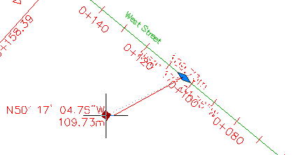 Main Street と East Street の両方の線形、およびこれらの測点ラベルが選択されていることに注目してください。ラベルが選択されたのは、線形が配置されている外部参照図面でラベルが作成されたためです。外部参照で作成されたオブジェクトのラベルは、ソース図面でしか編集することができません。