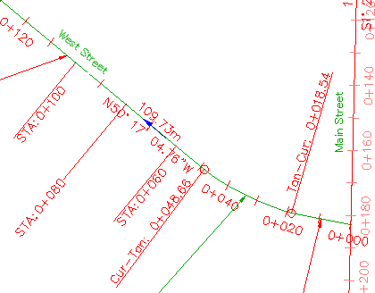 測点ラベル 0+060 のラベル スタイルのみが変更されます。West Street の残りの主測点ラベルは、現在のスタイルのまま変わりません。