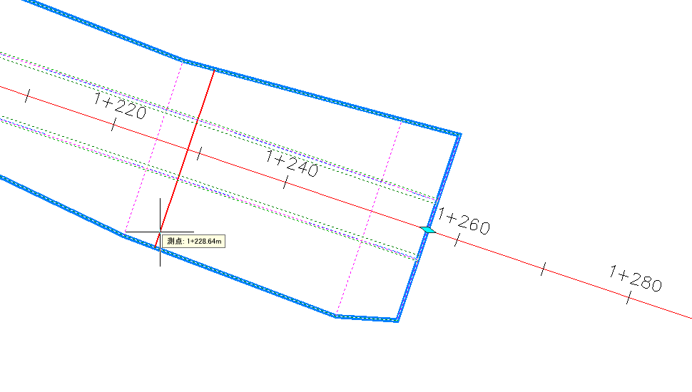 注: リージョンの分割は、[コリドー プロパティ]ダイアログ ボックスの[パラメータ]タブでも行うことができます。このタブのテーブルで、コリドー リージョンを右クリックして[リージョンを分割]を選択します。図面内で、線形に平行なポイントをクリックして、選択したリージョンを分割します。右クリックして分割ポイントの選択を終了し、[OK]をクリックしてリージョンを分割します。