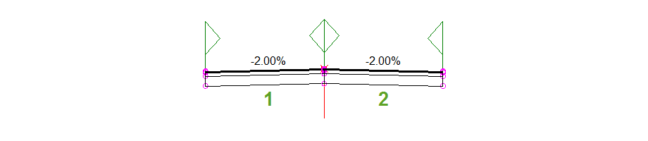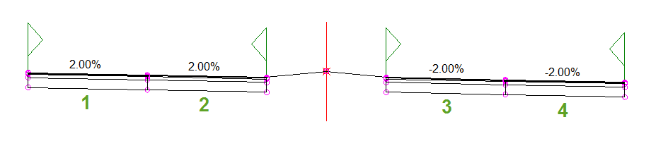 回転軸の基点を伴う分割クラウン付き道路アセンブリは、「クラウンに向かう」または「クラウンから離れる」のいずれかの内側車線勾配方向を使用して構築できます。この場合、内側車線勾配方向は、クラウンから離れます。