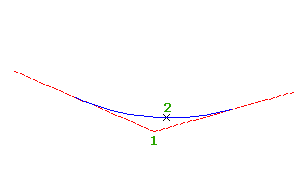 図は、終点 1 と終点 2 の間に最適フィットで作成された非固定縦断曲線を示します。X は、図形の作成に使用されたデータ ポイントを示します。