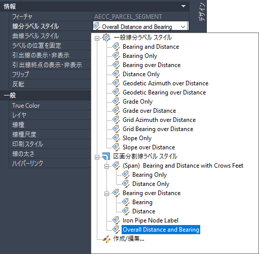 次の例では、[区画分割線ラベル]を編集する場合に、[区画分割線ラベル スタイル]に加え、[一般線分ラベル スタイル]も使用可能になっていることに注目してください。
