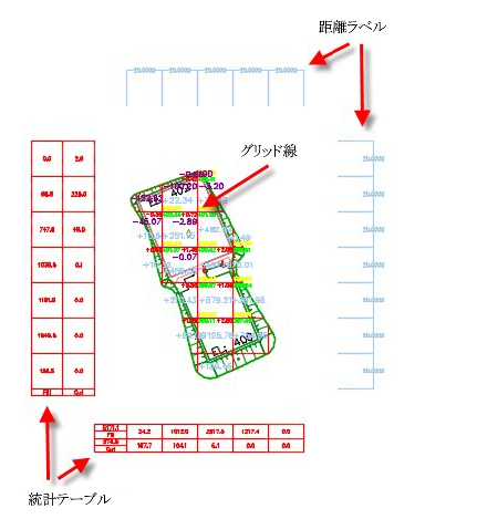 - [統計テーブル] : 切土と盛土の合計値と、グリッドの各行と各列の合計値を表示します。