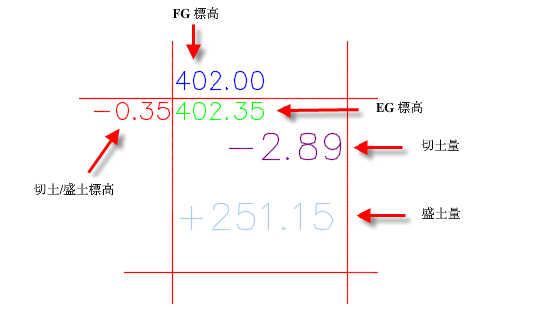 [境界の土量] : グリッド セルの形状が不規則な場合の土量ラベルの配置方法を指定します。