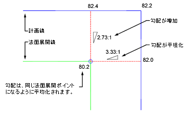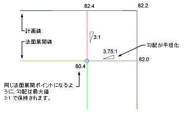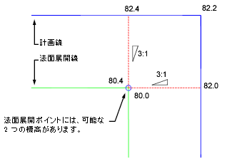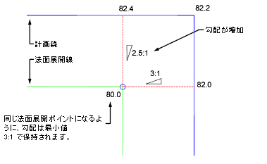 計画線コーナーに異なる標高が定義されている場合、内側コーナーの投影線をどのようにクリーンアップするかを指定します。この状況では、2 つの法面展開ポイント標高が考えられます。すべての勾配を平均化して同じポイントに達するようにするか、いずれかの勾配を増加または減少するかを選択できます。