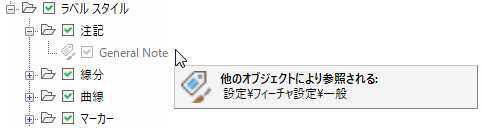 この例では、[一般]フィーチャ設定が一般注記スタイルを参照しているため、現在は一般注記のチェックボックスをオフにすることはできません。