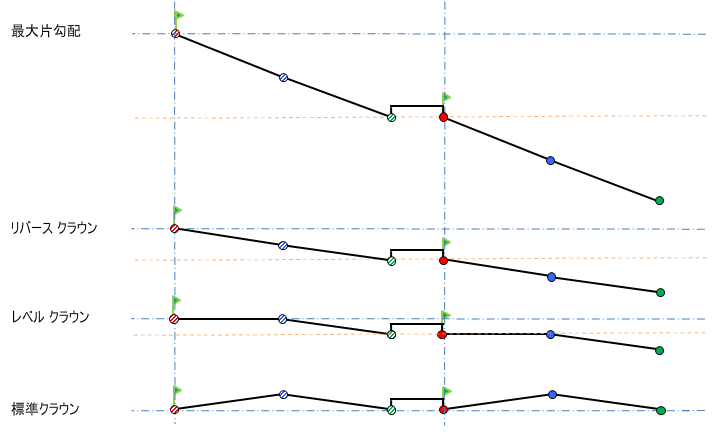 [中央分離帯の勾配を保持]は、横断勾配摺り付けを適用する際、中央分離帯の高さが横断勾配摺り付けに対応するように高くなることを意味します。このオプションでは、中央分離帯の形状は保持され、