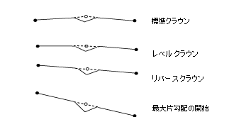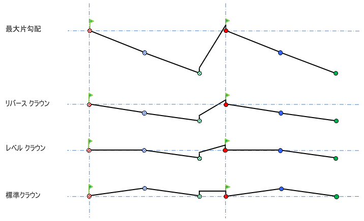 次の図は、コリドー タイプが分割道路で、各側の横断シェイプがクラウンである場合を示したものです。この道路では、横断勾配摺り付け中にアドバース クラウン リムーバルが行われます。