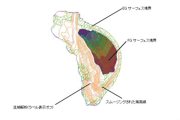 境界、等高線、および標高解析を示すサーフェス