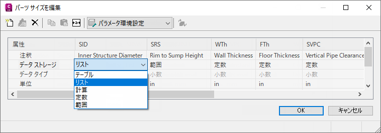 - パーツに指定できるサイズのリストを追加するには、サイズ パラメータのデータ ストレージ タイプを[リスト]に変更します。
