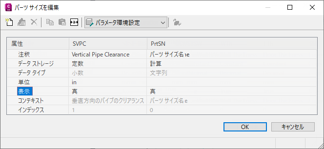 [パーツ サイズを編集]ダイアログ ボックスが表示されます。このダイアログ ボックスには、選択したパーツで使用できるサイズ パラメータがすべて表示されます。基本型の円柱構造物の場合、既定のサイズ パラメータは、パーツ サイズ名(PrtSN)と構造物の垂直方向のパイプのクリアランス(SVPC)です。