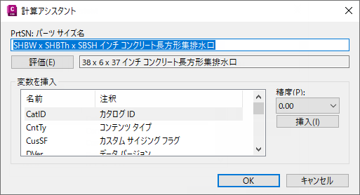 パラメータ値に関連付けられた計算式が表示されます。たとえば、構造物のパーツ サイズ名(PrtSN)の計算式は、“SHBW x SHBTh x SBSH インチ コンクリート長方形集排水口” となります。また、パイプの場合の計算式は、FormatNumber($PID,0) + “ インチ コンクリート パイプ” となります。