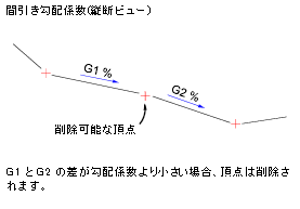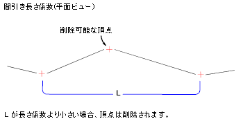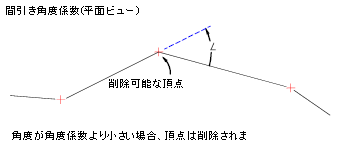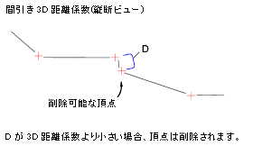 頂点は、線分の位置で不要となった場合に、角度、勾配、長さ、および 3D 距離の間引き係数に基づき間引かれます。間引き処理に選択されたポイントは、赤で強調表示されます。