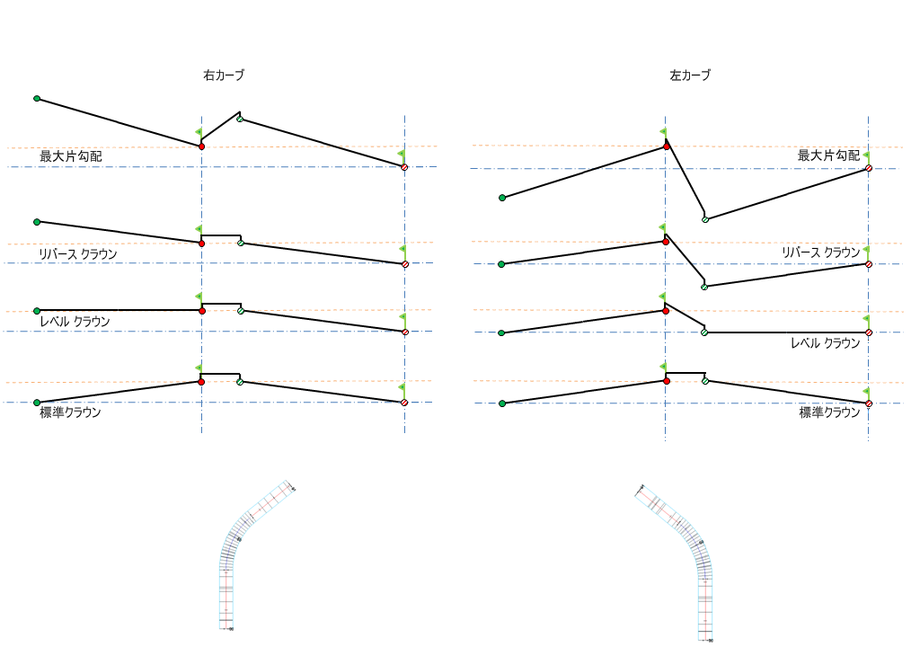 横断勾配摺り付け図の説明については、「概要 - 横断勾配摺り付け回転軸の基点設定方法」を参照してください。