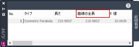 このウィンドウは、縦断をグリップ編集する場合、または別のコマンドを入力する場合には開かれたままとなります。現在選択している縦断を削除したり、ウィンドウ上部の右端にある[X]ボタンをクリックしたり、[縦断レイアウト ツール]ツールバーの