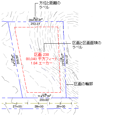 各区画には、区画全体を参照する面積ラベルがあります。面積ラベルをクリックすると、区画を選択できます。区画には、区画に関する情報を表示するセグメント ラベルや関連付けられたテーブルを持たせることもできます。ラベルには、ユーザ定義のプロパティ フィールドを含めることもできます。