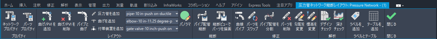 注: [圧力管ネットワーク縦断レイアウト] リボンにアクセスするには、圧力管ネットワークが