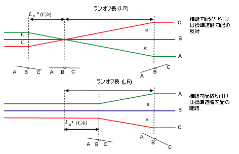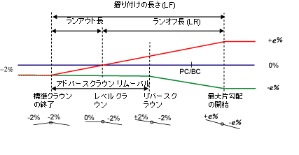 次の図は、コリドー タイプが非分割道路で、横断シェイプが片側である場合を示したものです。この場合、クラウンはないため、アドバース クラウン リムーバルは不要です。通常、このタイプの道路は、非横断勾配摺り付け横断に一方向の下向き勾配があります。このため、完全な横断勾配摺り付けを実現するために必要な距離は、横断勾配摺り付けが下向き勾配の方向に続いているか、通常の下向き勾配の反対方向への横断勾配摺り付けなのかによって決まります。これらは、ランプ、一方通行道路、および一部の補助道路に特徴的な性質です。