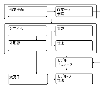 次の図に、モデルを構成するフィーチャを示します。矢印は、フィーチャ間の関係の方向を示しています。たとえば、ジオメトリの修正は側面に影響を与え、側面は変更子に影響を与えます。各フィーチャについての説明を読むときには、この図もあわせて参照してフィーチャ間の関係について理解してください。