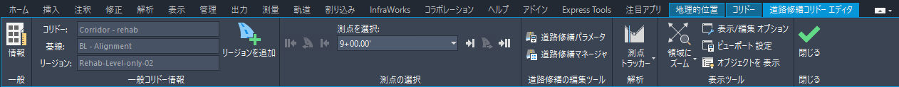 道路修繕コリドー内の道路修繕リージョンを選択すると、[道路修繕コリドー エディタ]リボン タブが表示され、