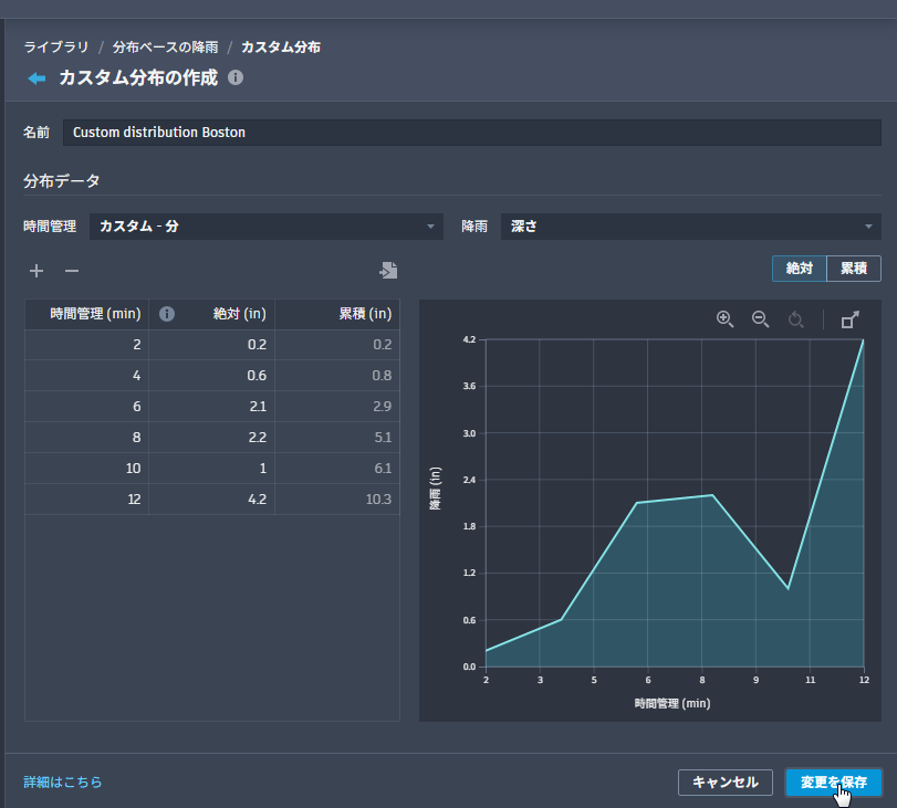 カスタム分布の作成では、分布ベースの降雨イベントに対する降雨分布(時間パターン)を定義します。