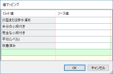 表示されている Civil 値ごとに、ArcGIS 属性に割り当てられているソース値を入力できます。ソースでパーツのソース値が見つかると、そのパーツに Civil 値が適用されます。