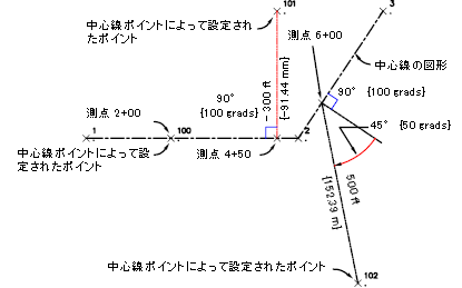 ポイント 100 が、オフセット ゼロで測点 200 に配置されます。ポイント 101 は、測点 450 から左オフセット 91.44 の距離に配置されます。ポイント 102 は、測点 600 から右オフセット 152.4 の距離にひずみ角 50 で配置されます。