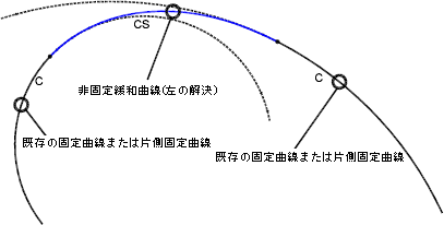 2 つの線分の間に非固定緩和曲線を追加するのは、その緩和曲線が、アタッチされる線分に常に接している必要がある場合です。この解決法では、緩和曲線は基本型、始点側、または終点側となります。
