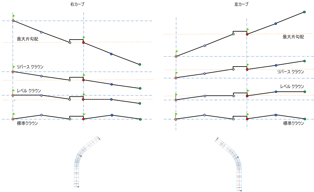 横断勾配摺り付け図の説明については、「概要 - 横断勾配摺り付け回転軸の基点設定方法」を参照してください。
